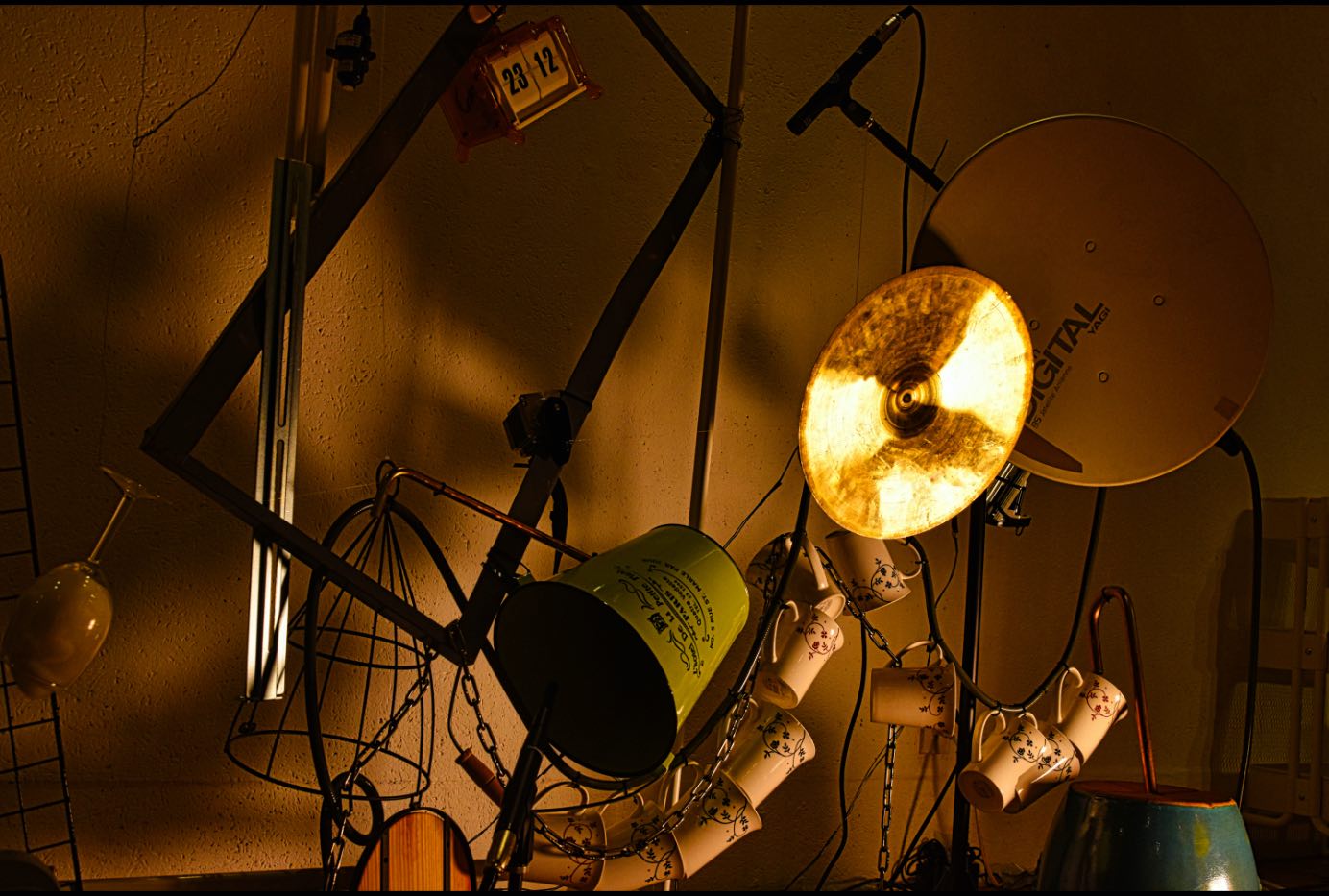 Discarded everyday objects (mugs, flower pots, glass, iron fragments), stepping motors, nylon threads, MAX/MSP, Ableton Live