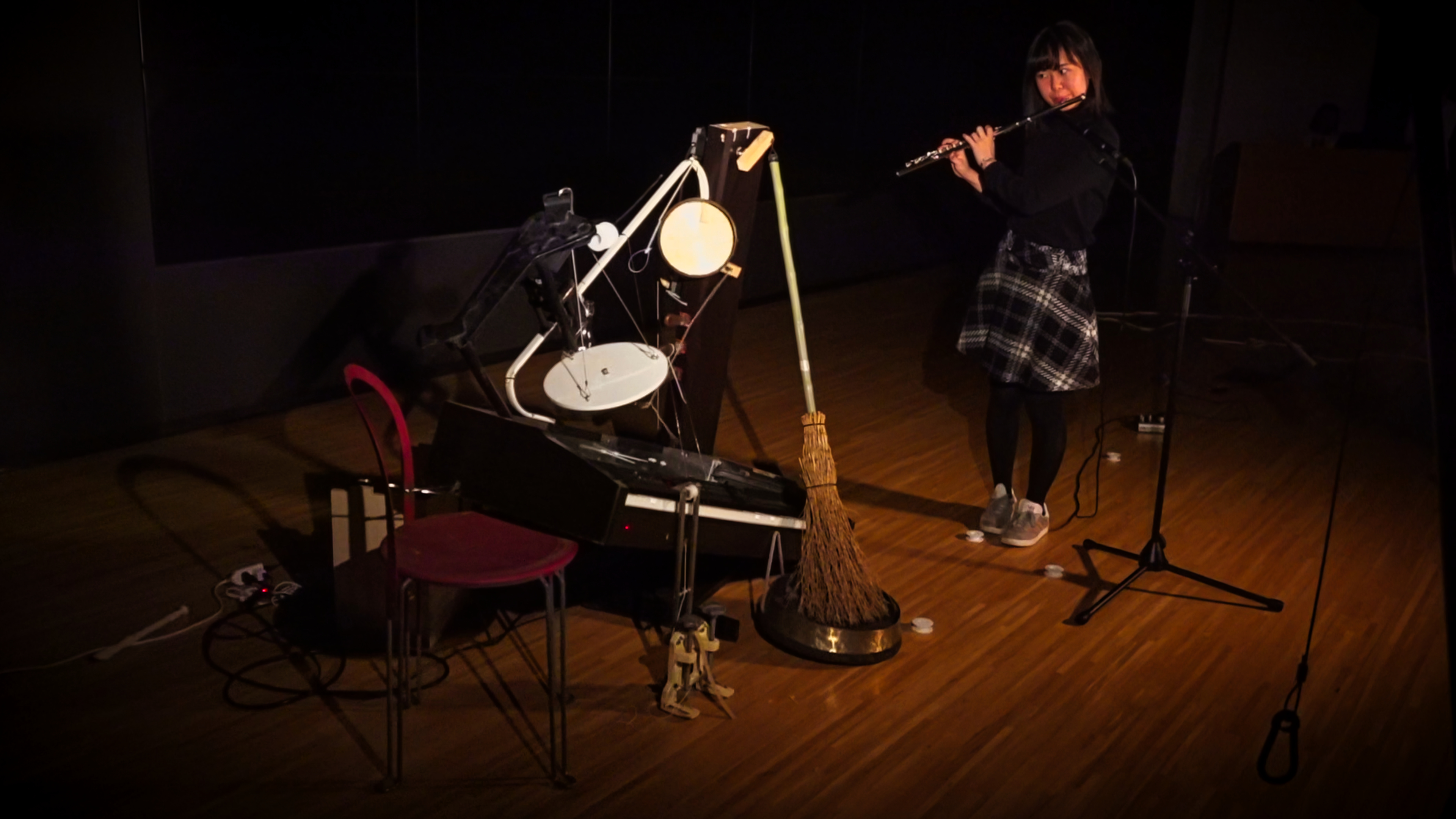パフォーマンスにおいて、キネティックな彫刻群はフルート奏者・藤本未来の音に対して能動的に応答する。モーターが物理的に糸を牽引することで、廃棄物同士がリアルタイムに衝突し、摩擦し、物理的な共鳴を発生させる。この相互作用は、人間の音楽性と廃棄物の物理的な摩擦とが絶えず交渉し合い、展開される楽曲構造を決定していく自己生成的なフィードバックループを生み出す。